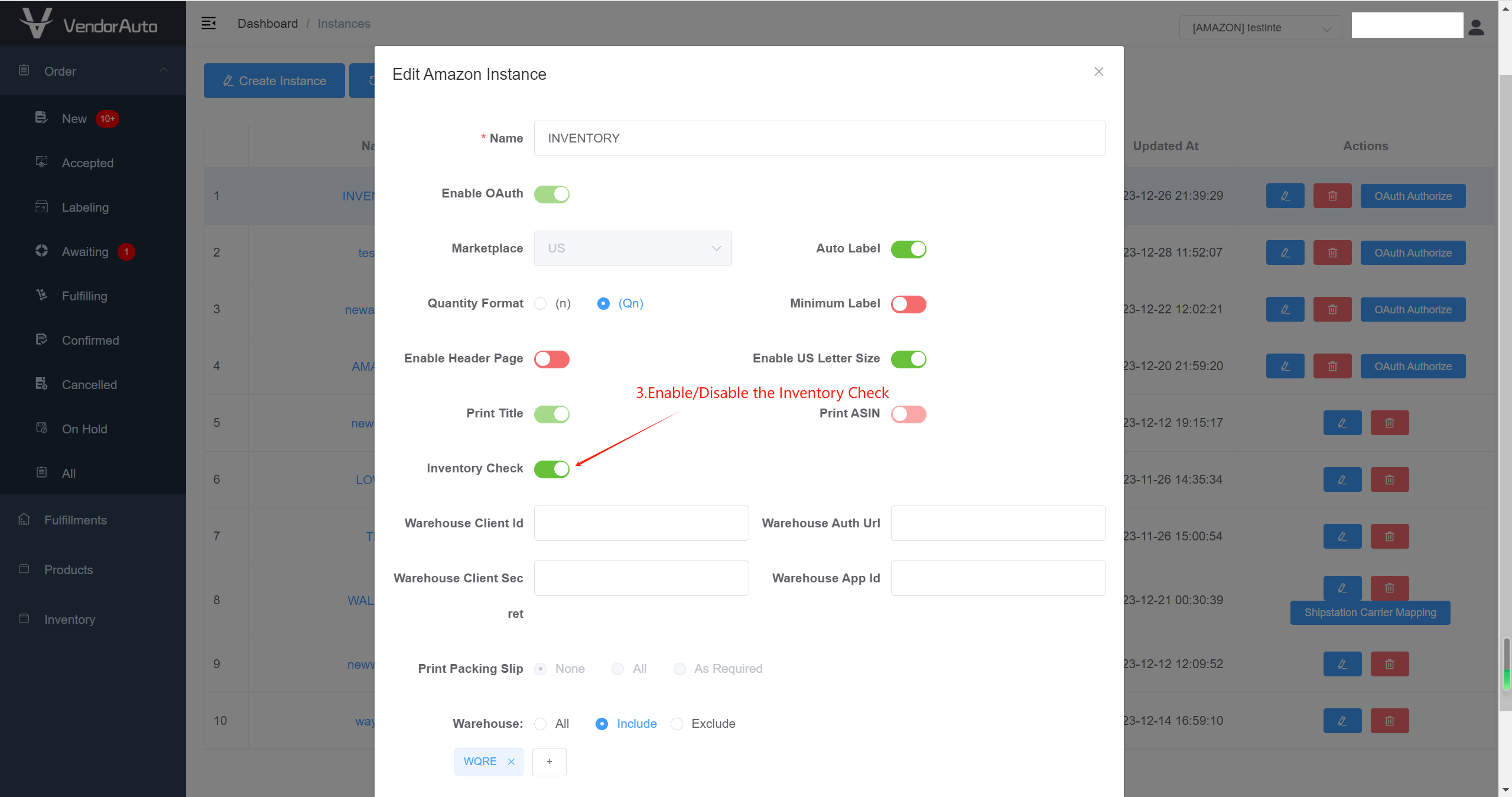 - When Auto Label is enabled, if any product in an order has insufficient inventory when the order is synchronized to the system, the order will be returned to the NEW list, and the order number will display an error message "No inventory". If all products in the order have sufficient inventory, the order will be synchronized to the Awaiting list. To enable/disable the inventory check, follow these steps: